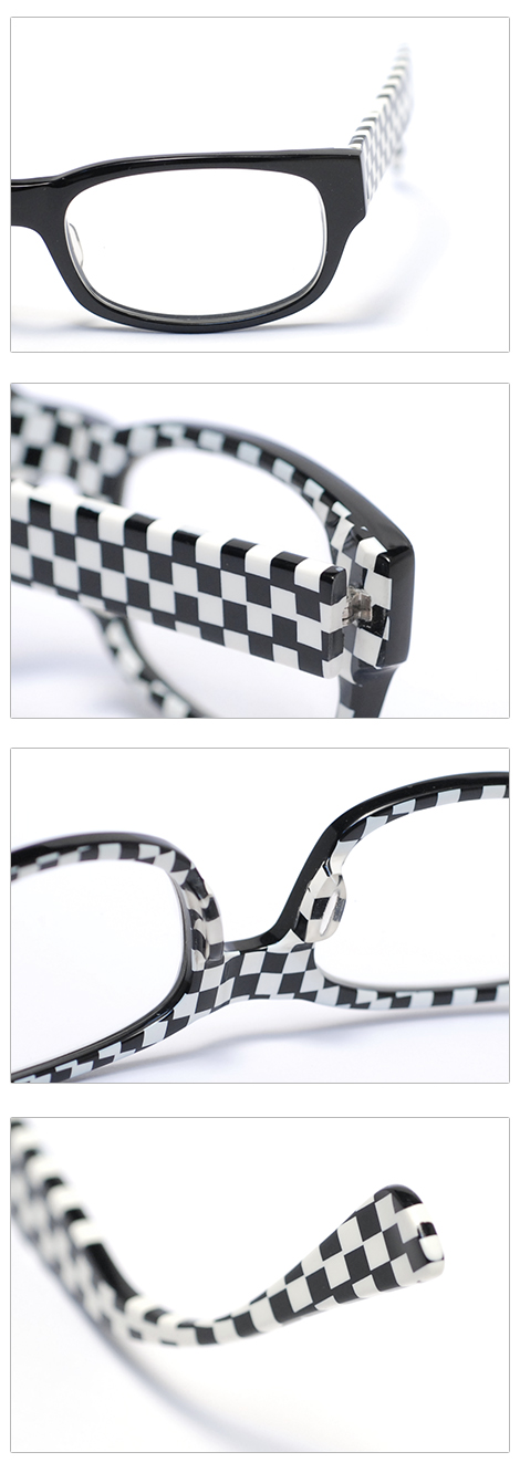 전면은 유광 블랙이고 후면과 템플은 체스판 무늬로 매치하여