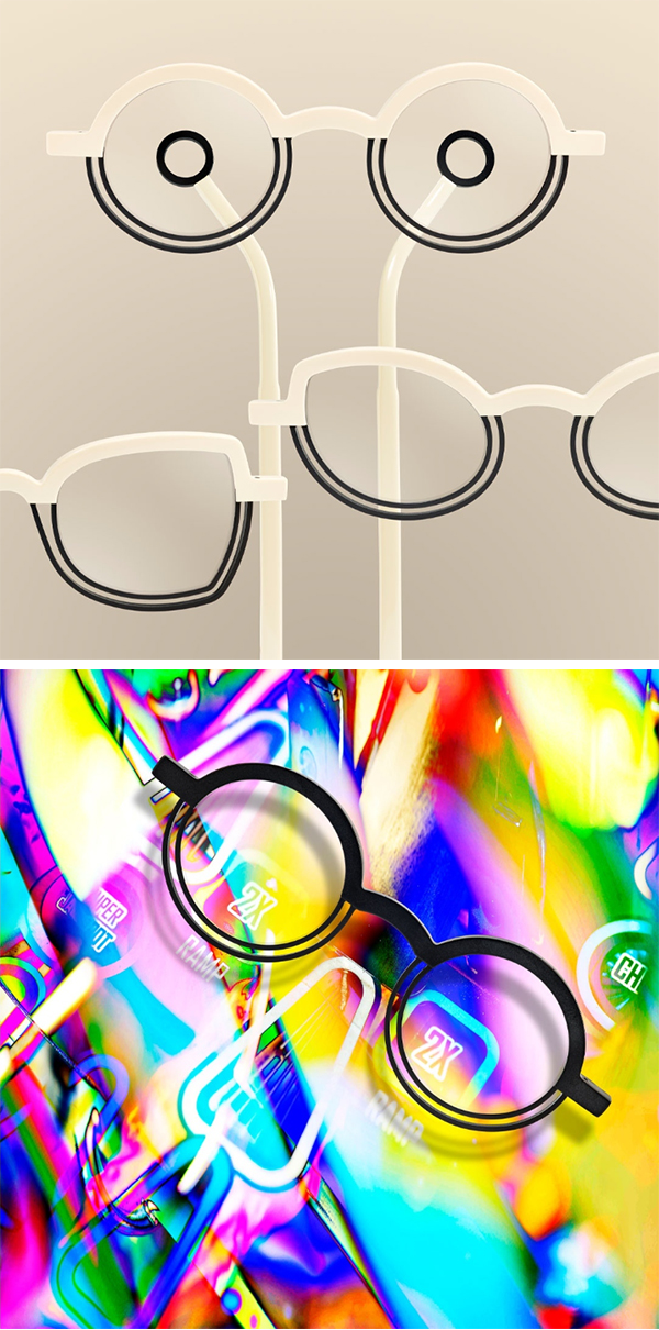 상반부 화려한 아세테이트는 '핀볼 경기판', 하반부는 '와이어 램프' 모양, 템플 팁은 '볼 홀더'.